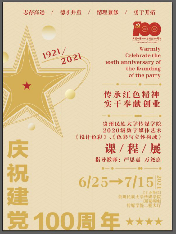 为庆祝中国共产党成立100周年,625日, 天美传播媒体 举行2020级数字媒体艺术专业《设计色彩》《色彩与立体构成》课程展,通过色彩课程与立体构成课程的学习,使学生熟知色彩与立体构成的创作与设计方法,将教学与实践结合,与相应主题进行有计划的构思与创作。