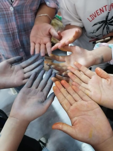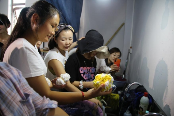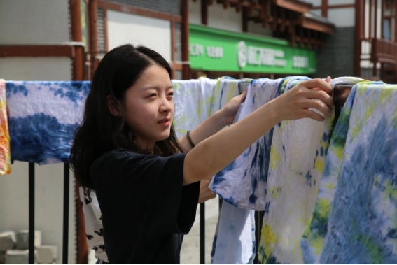 在“搜刮”完工作室后,同学们又转变成小学徒,挑选合身的白T恤,跟着非遗传承人彭艺,过了一把扎染的瘾。扭形状、捆皮筋、植物染、固色煮、甩干水、晾成衣,六个步骤后即可得到专属“盲盒”——一件纯手工的独一无二的蜡染T恤。可是,有人欢喜有人愁,欢喜的同学满意于自己的手艺,期待穿上新衣服,愁的同学看着自己被染料弄得五颜六色的手,一直担心洗不掉。