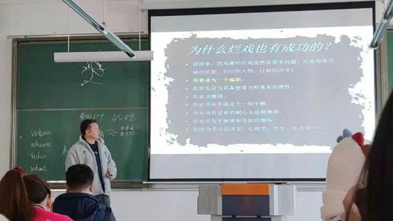 新校区教1-C120教室开讲。来自文学院戏剧影视文学系的周奕言老师是这场讲座的主讲人。他不仅给学生们讲授了“剧本情节写作艺术”的内容,还分享了他的个人创作经历研究成果。