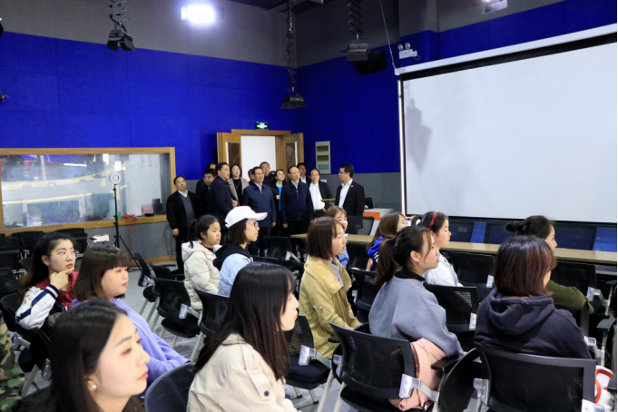 校党委书记张学立(右二)、校长陶文亮(左二)、与多彩贵州网党委书记、董事长陈麟(右一)参观学校
