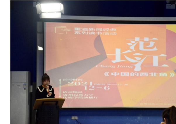 分享会上,主持人2021级广播电视专业的毛凯妮同学对范长江及他的作品《中国的西北角》作了简要介绍,六名同学先后分享了自己的读书体会。新闻与传播专业的黄珍玉同学表示:“此书中让我最难以忘记的,是范先生对当时所见情景的描写。‘人们抢着吃已经恶臭的饼团,街道、室内都是散发着恶臭的死尸’的描述,他通过直接且详细的描写,给我们呈现了一个真实而又让人痛心的西北角面貌。”