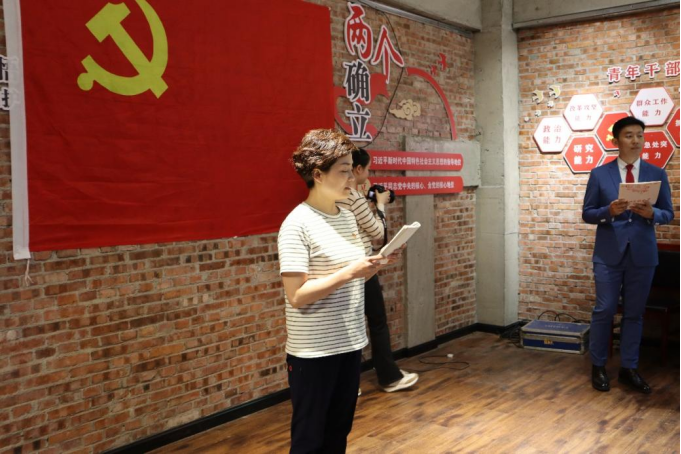 教师党员管倩领誓,新老党员们一起面对鲜红的党旗,庄严地举起右手,共同向党旗庄重宣誓。