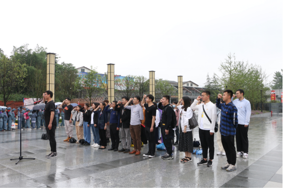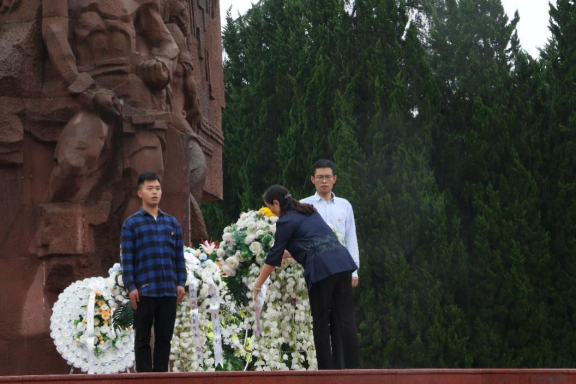 最后,在纪念馆广场雕塑前,全体党员向革命先烈敬献花篮,面向党旗,在研究生第二支部杜凯同志的带领下重温入党誓词。