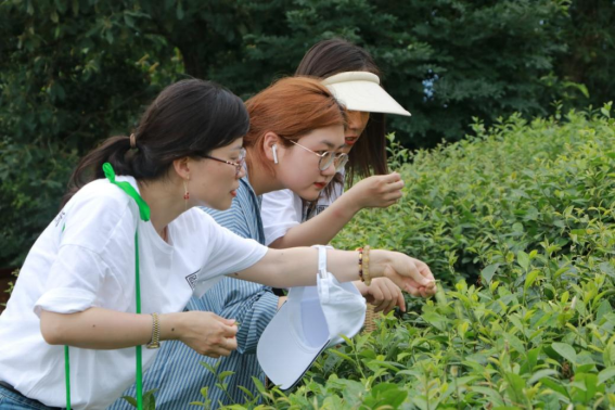 湄潭县的金花村27°景区是他们此次调研目的地之一,金花村股份经济合作社总经理刘建顺在27°景区向大家介绍了湄潭茶旅一体化发展情况,清华学子挎上竹筐,跟着茶农现场学起了采茶。