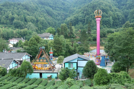 穿过重重密林,大家来到了金花村七彩部落。映入大家眼帘的,是五颜六色的小型游乐设施。教育部学位管理与研究生教育司柴高尚感叹道:“这个地方竟然会有游乐场!” 七彩部落实际上是一个自然村民组,地处湄潭“翠芽27°”茶旅一体化4A级景区核心地带。在村民为主体的基础上,政府对金花村进行了卫生净化、环境美化和村寨亮化。同时,在金花村着力打造特色景观,建设游乐设施,凸显了其美轮美奂的童话世界和乡村文化。