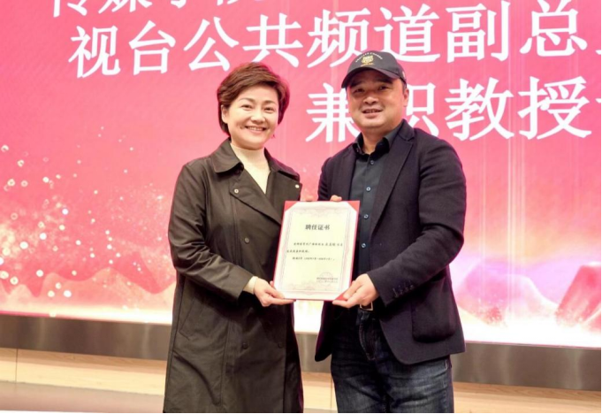 副院长钟华向贵州广播电视台公共频道副总监石昌晗颁发兼职教授证书。