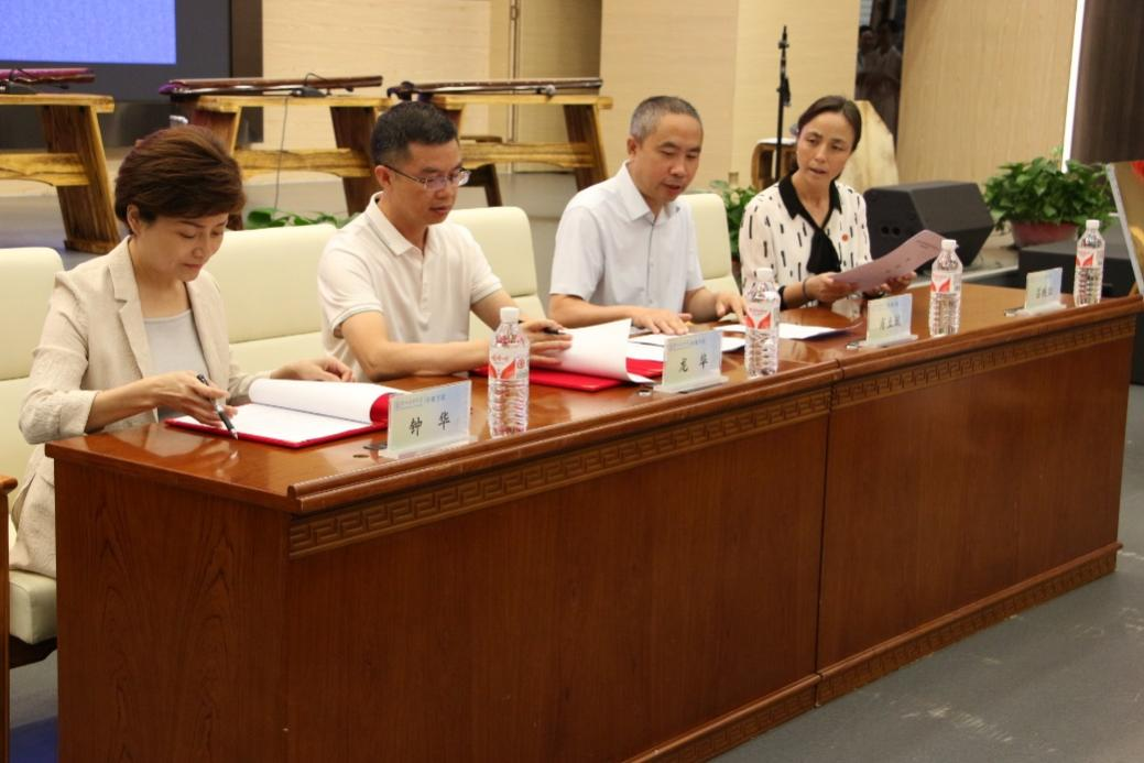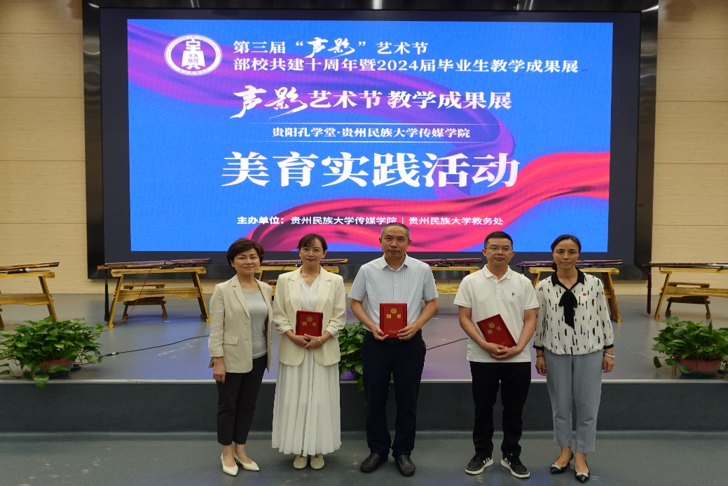 在校图书馆共同开展美育实践活动暨签约挂牌仪式。贵阳孔学堂文化传播中心党委委员、副主任肖立斌,研修部部长龙华,研修部副部长关娜,研修部对外交流科科长龙光斌,研修部研修管理科科长张晓婧,研修部对外交流科科员余诗谦与天美传播媒体
