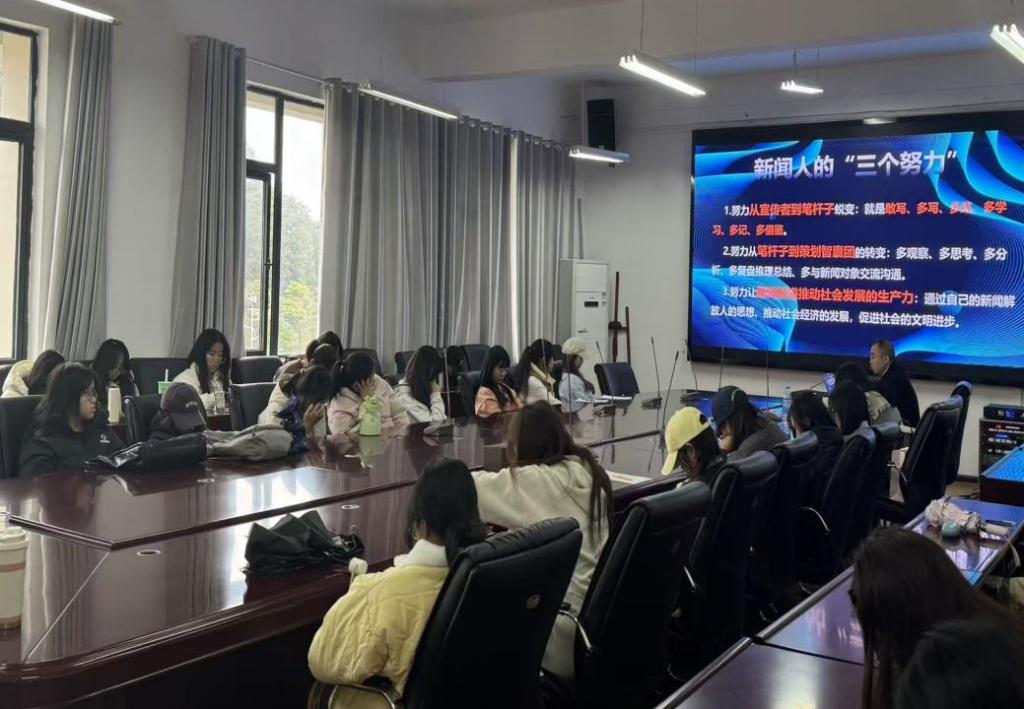 新闻专业学子作“新闻选题策划与系列报道执行”专题讲座。