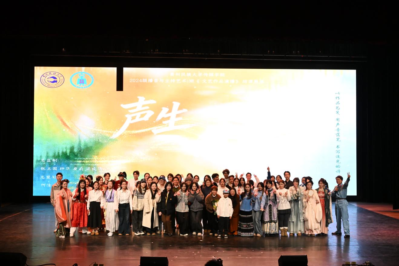 此次展演总导演、2024级播音一班杨骆凌云解释了“声生向光”的寓意:“‘声’是专业根基,‘生’象征生长,‘向光’则代表我们始终追求光明、用声音传递正向力量的初心。”展演的最后,2024级播音与主持艺术专业一班全体同学以一句“24播主,声生向光!”的激昂口号收尾,为整场展演画上圆满句号。